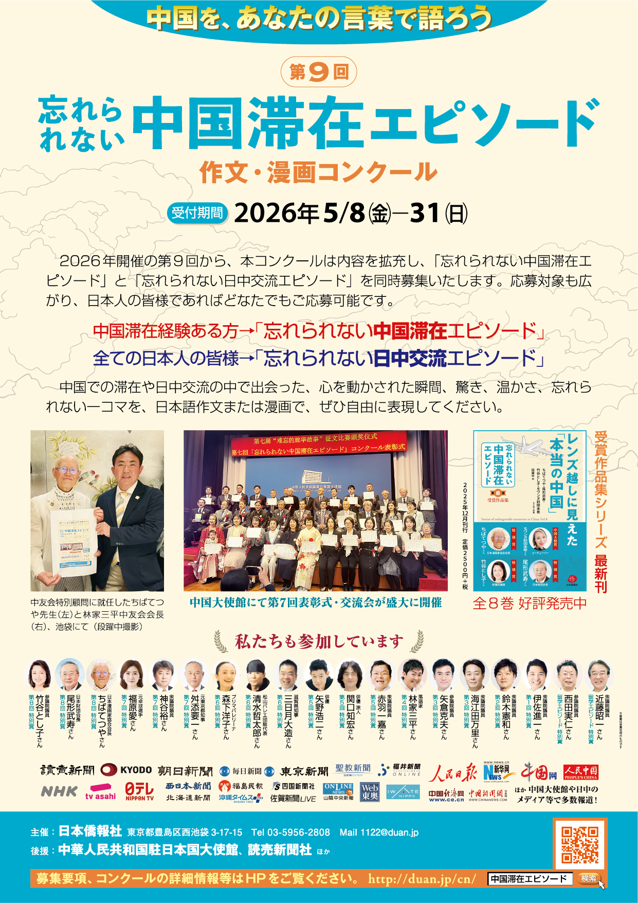 2026年、日本僑報社主催、中華人民共和国駐日本国大使館、読売新聞社など後援の第9回「忘れられない中国滞在・日中交流エピソード」作文・漫画コンクールを開催します。