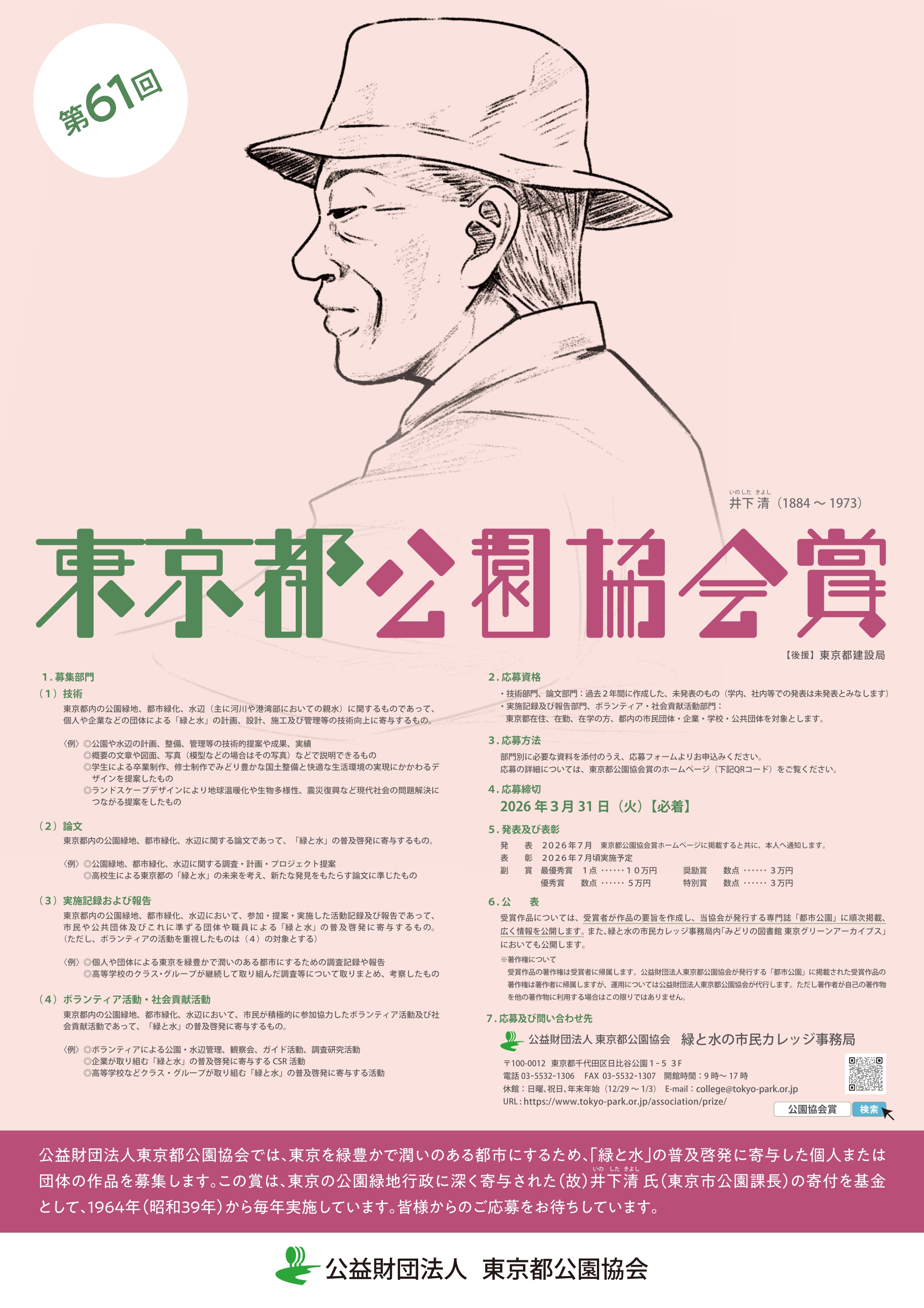- 発表 令和8年7月に、下記の東京都公園協会賞ホームページに掲載すると共に、ご本人へ通知します。